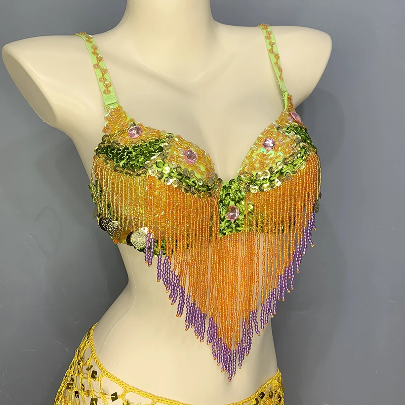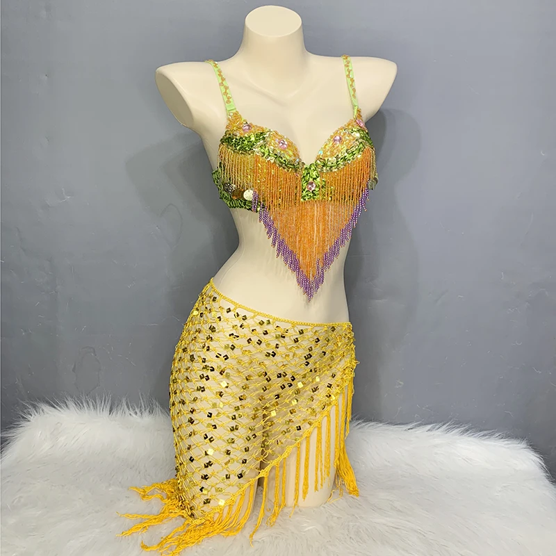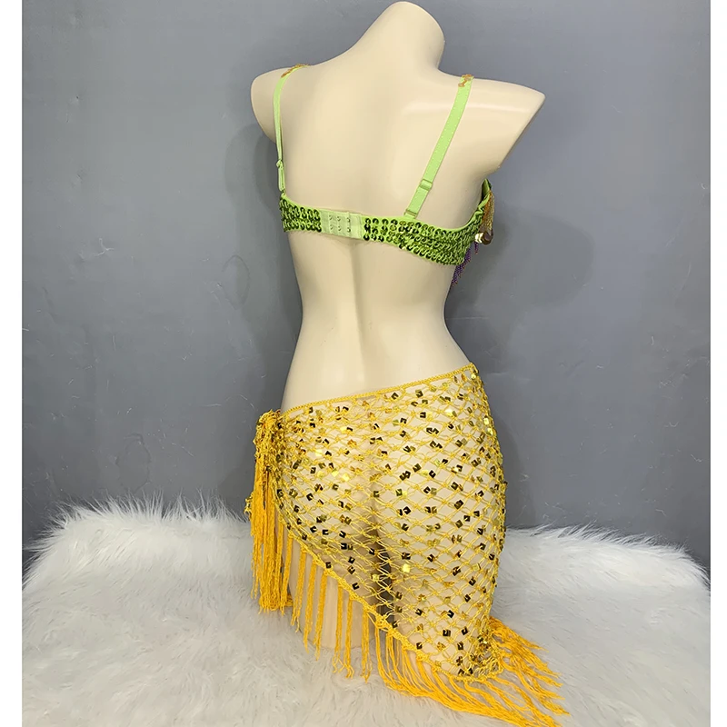- Product Name: New Women Belly Dancing Suite Beaded Sequined Bra+ Long Tassel Hip Scarf 2PCS Set Samba Costumes Club Night Dance Wear N21007